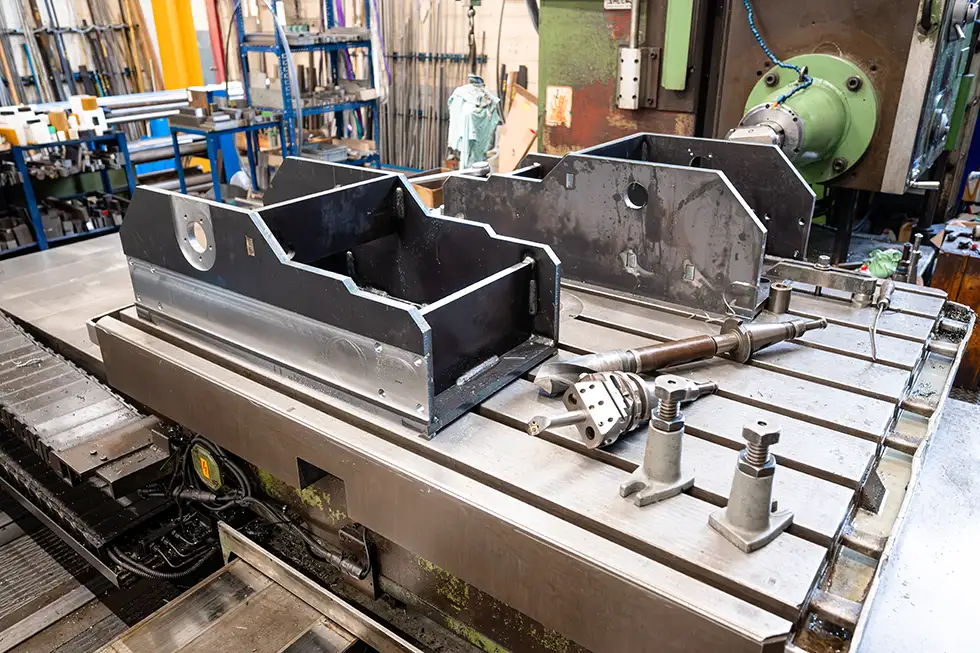 Bâti mécanosoudé : Conception et réalisation d’un bâti mécanosoudé en acier de 2,4 m pour le secteur papetier. Certains éléments ont été pré-usinés avant soudure, puis, après stabilisation, nous avons usiné les portées de guidage pour garantir un alignement précis.